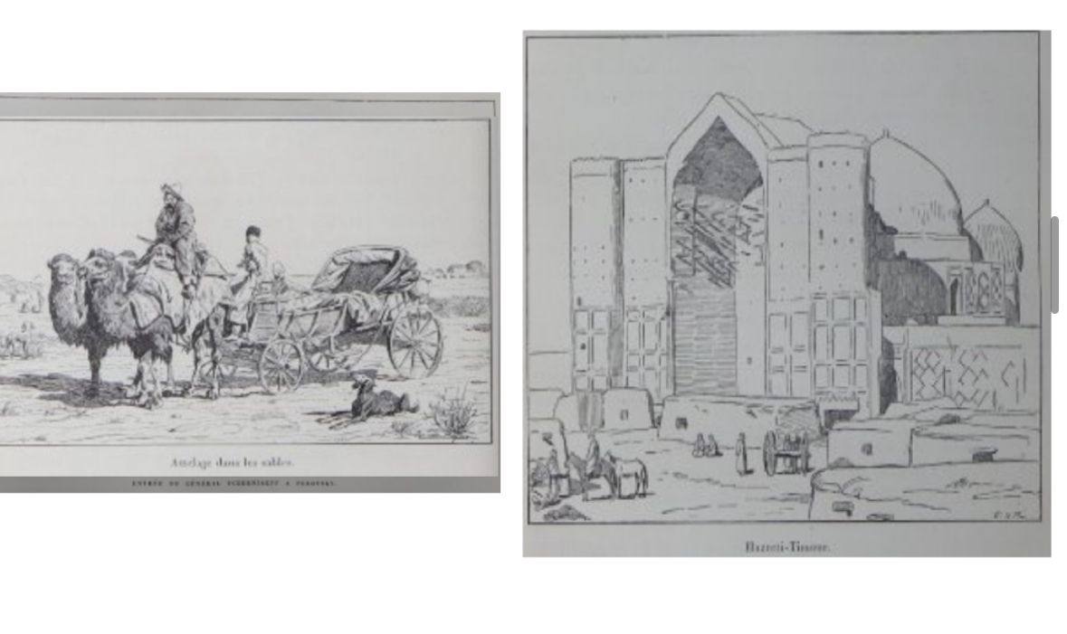 Vambéry’s journey through Central Asia captured vivid accounts of daily life, accompanied by detailed illustrations depicting landmarks such as the Khoja Ahmed Yassawi mausoleum in Turkistan.
