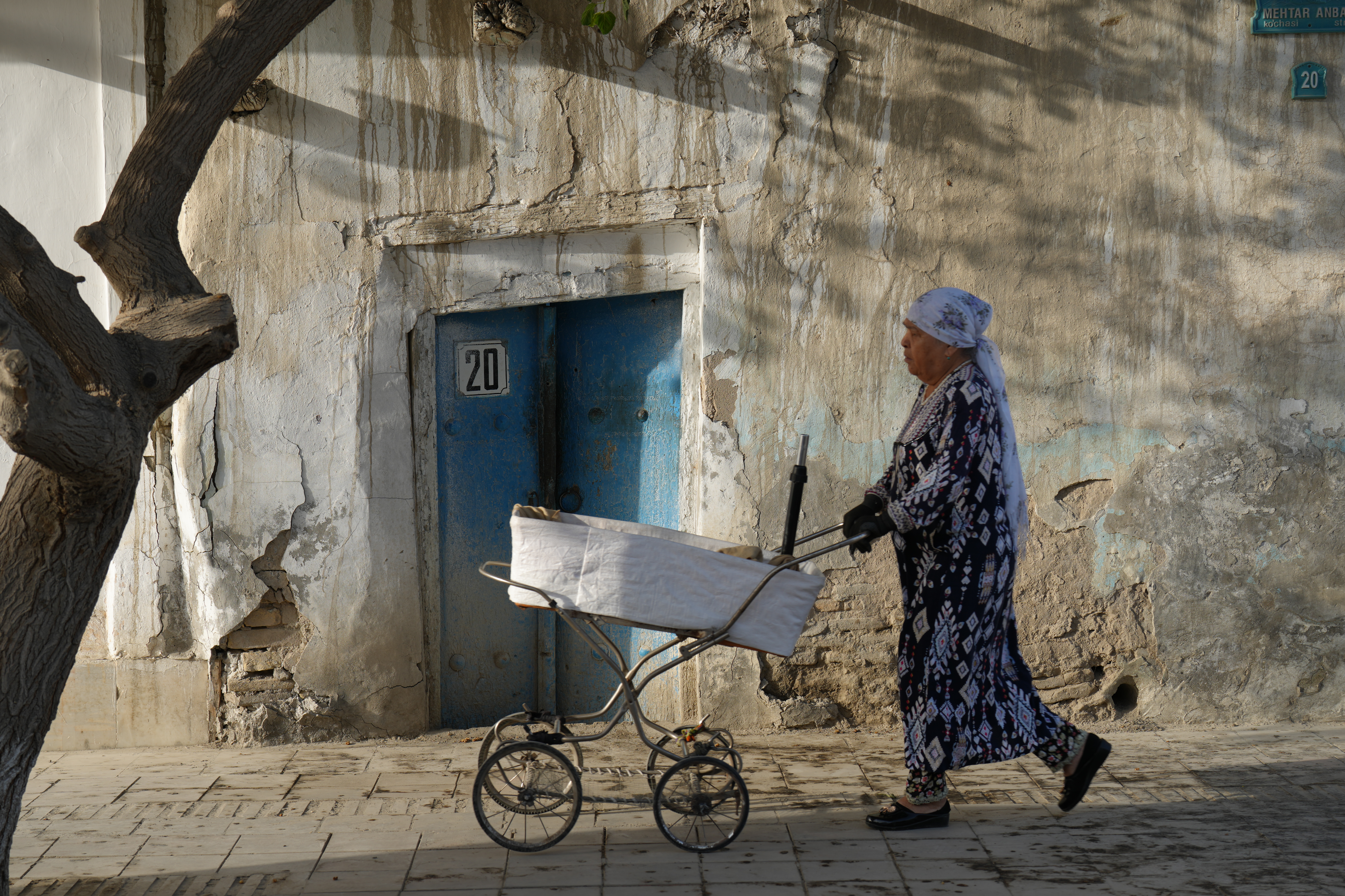 A woman delivers bread to homes in the early morning light of Bukhara, Uzbekistan. Photo credit: Phil Pasquini.