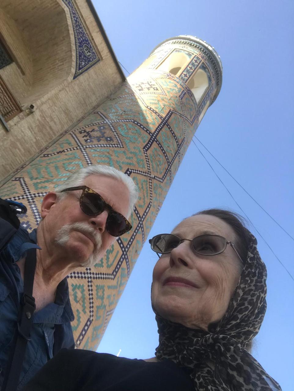 Phil and Elaine Pasquini stand at a mosque near the Chorsu Bazaar in Tashkent.