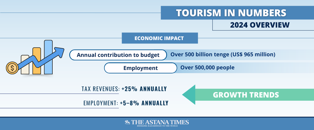 Tourism contributes more than 500 billion tenge (US$ 965 million) to the national budget each year and employs over 500,000 people. The sector continues to grow, with tax revenues increasing by 25% annually and employment expanding by 5-8%.