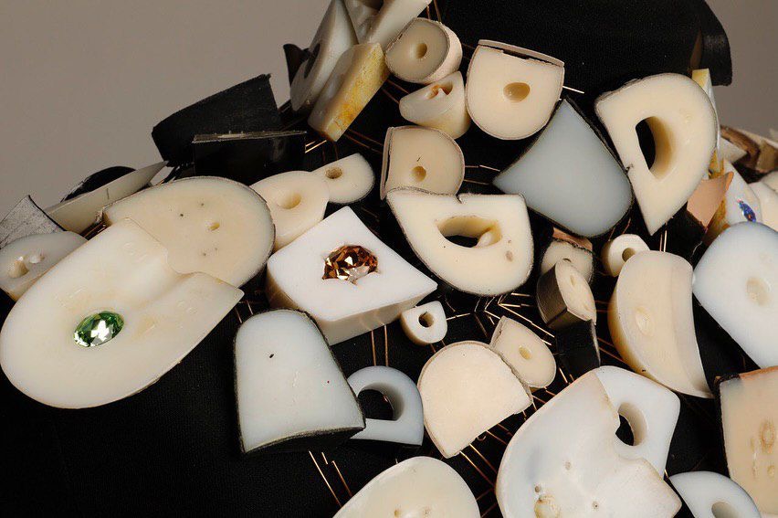 She cited an artwork from the Syldyr project by Zhanna Asanova titled “6 out of 100”. It features a necklace made of 100 broken heel parts and Swarovski crystals. Only six heels contain a crystal, representing the six women CEOs among the top 100 UK companies in 2019. The broken heels without crystals symbolize women passed over for promotion, an outcome that might have differed if they were men.