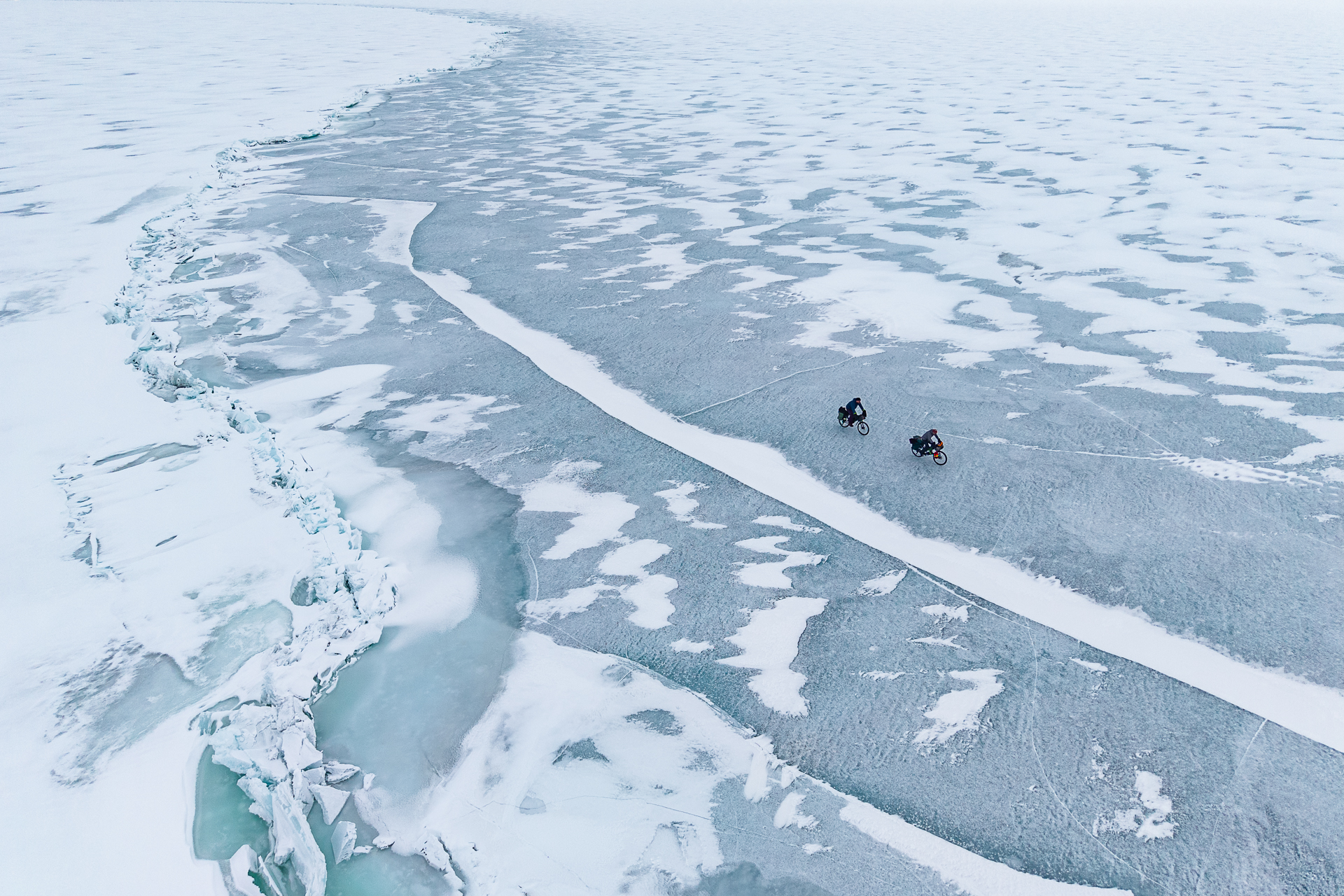 Clear ice, a vast horizon, and the feeling of complete freedom are what attracts two Polish cyclists Ryszard Jakubowski and Jakub Rybicki to cycle on frozen lakes. Photo credit: Jakub Rybicki
