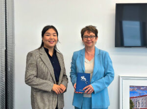 The Astana Times journalist Assel Satubaldina and EBRD President Odile Renaud-Basso, as she congratulates The Astana Times on its 15th anniversary this year. Photo credit: Nargiz Raimbekova/ The Astana Times