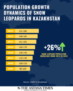 According to the United Nations Development Programme (UNDP), Kazakhstan’s snow leopard population increased by 26% between 2019 and 2024, from 140 to 170 individuals to 152 to 189. Around 70% of them now live in protected zones.