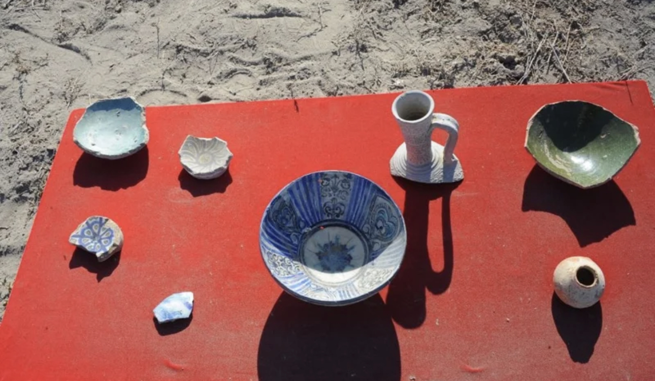 Recovered items include ceramic vessels, glass bracelets, beaded rings, and a gold coin from the 14th century. All artifacts are stored at the Atyrau Regional Museum of History and Local Lore. Photo credit: Kazinform