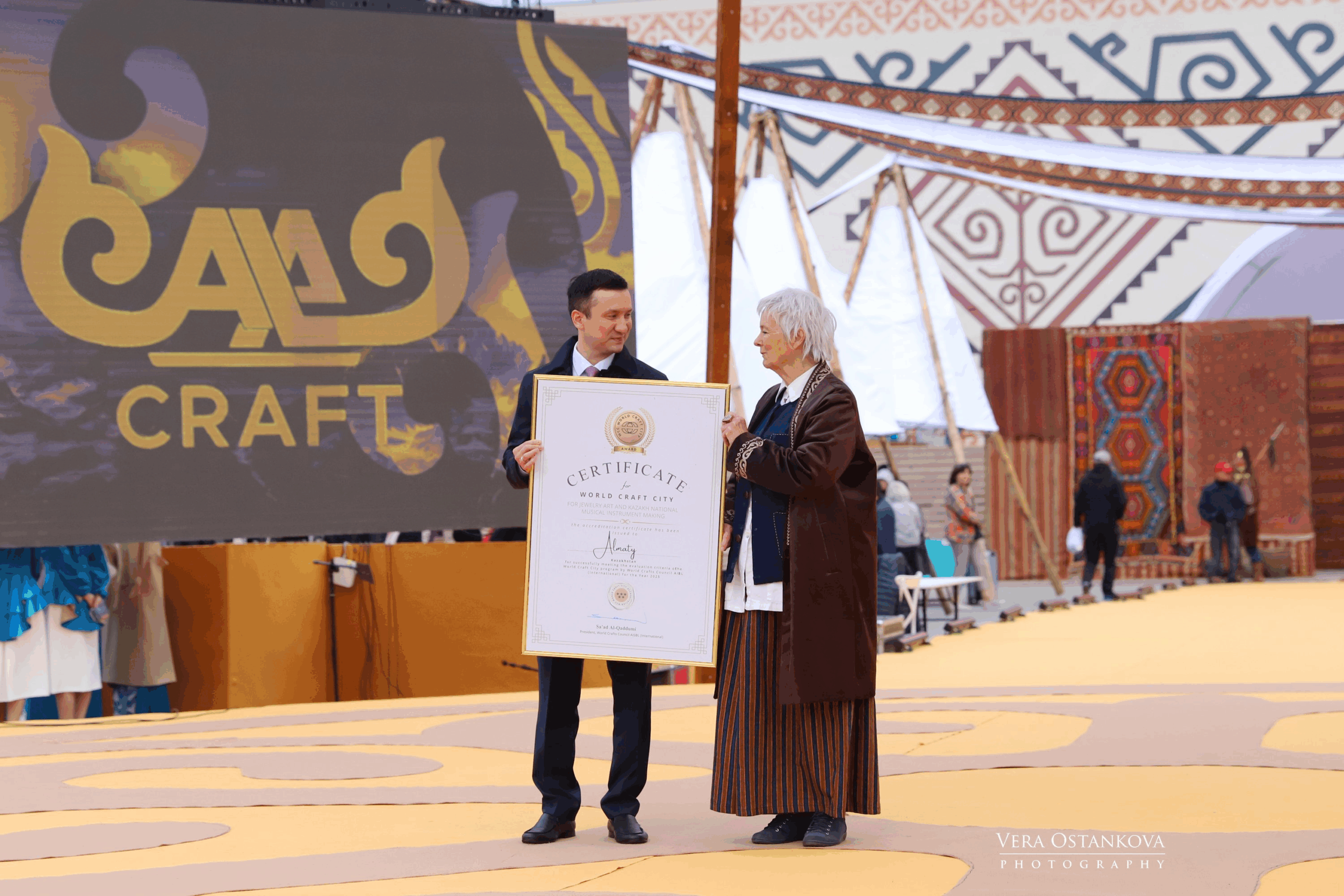 Jude van der Merwe, President of the WCC Asia-Pacific Region, awards Almaty with World Craft City status Photo credit: Vera Ostankova