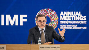 IMF Chief Economist Gourinchas warned that escalating trade tensions between the US and China, could shave up to 0.6 percentage points off global GDP by 2028 on Oct. 16 during IMF/World Bank Annual Spring Meetings in Washington, D.C. Photo credit: IMF