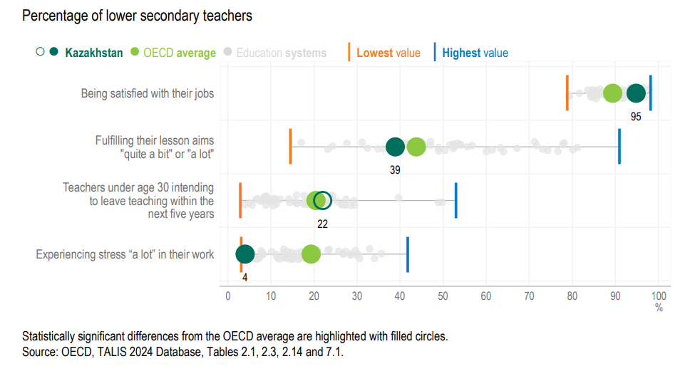 According to the survey, 90% of new teachers in Kazakhstan, who completed initial training within the past five years, rated their education as high quality, exceeding the OECD average of 75%.