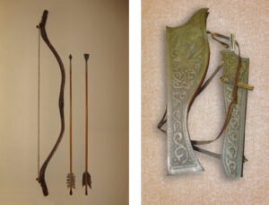 The main projectile weapons were the bow and arrows. The battle bow was made from several parts crafted from different materials such as wood, bone, horn, birch bark, sinew, and leather. Photo credit: tengrinews.kz