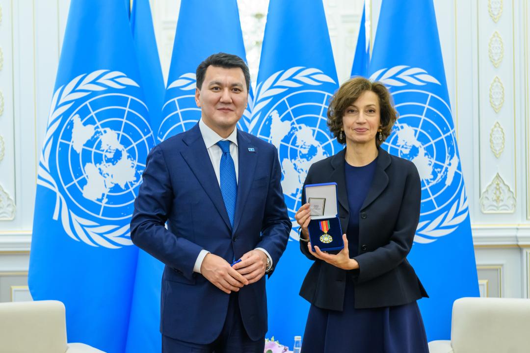 Karin presents outgoing UNESCO Director-General Audrey Azoulay with the Order of Dostyk, second degree, on behalf of President Kassym-Jomart Tokayev. Photo credit: Kazakh Ministry of Foreign Affairs