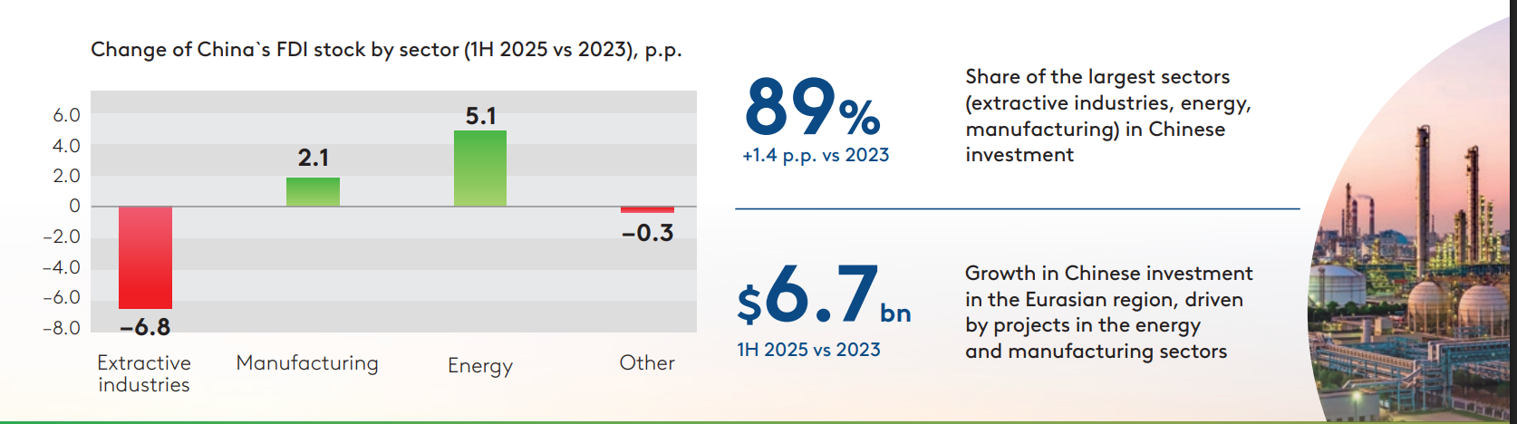 The report highlights a structural shift in Chinese investment across Eurasia. While extractive industries have historically dominated, manufacturing and energy are now driving growth. Over the past decade, China’s total investment in the region increased by 80%, reaching $66 billion by mid-2025.