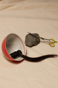Omirzak turns hair into her canvas, embroidering it with the traditional keste technique. Photo credit: Omirzak’s personal archieve