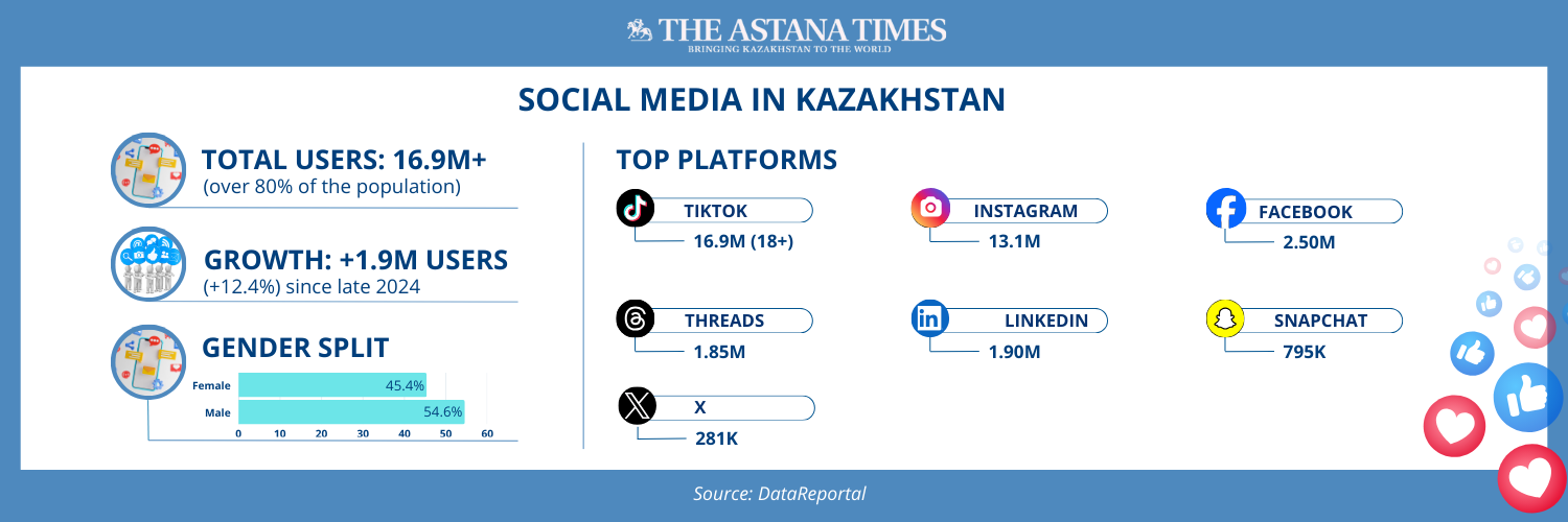 In Kazakhstan, more than 16.9 million people, over 80% of the population, use social networks, according to DataReportal’s Digital 2026: Kazakhstan report. The audience grew by nearly two million in the past year alone, underscoring social media’s role in everyday communication, media consumption, and business activity.