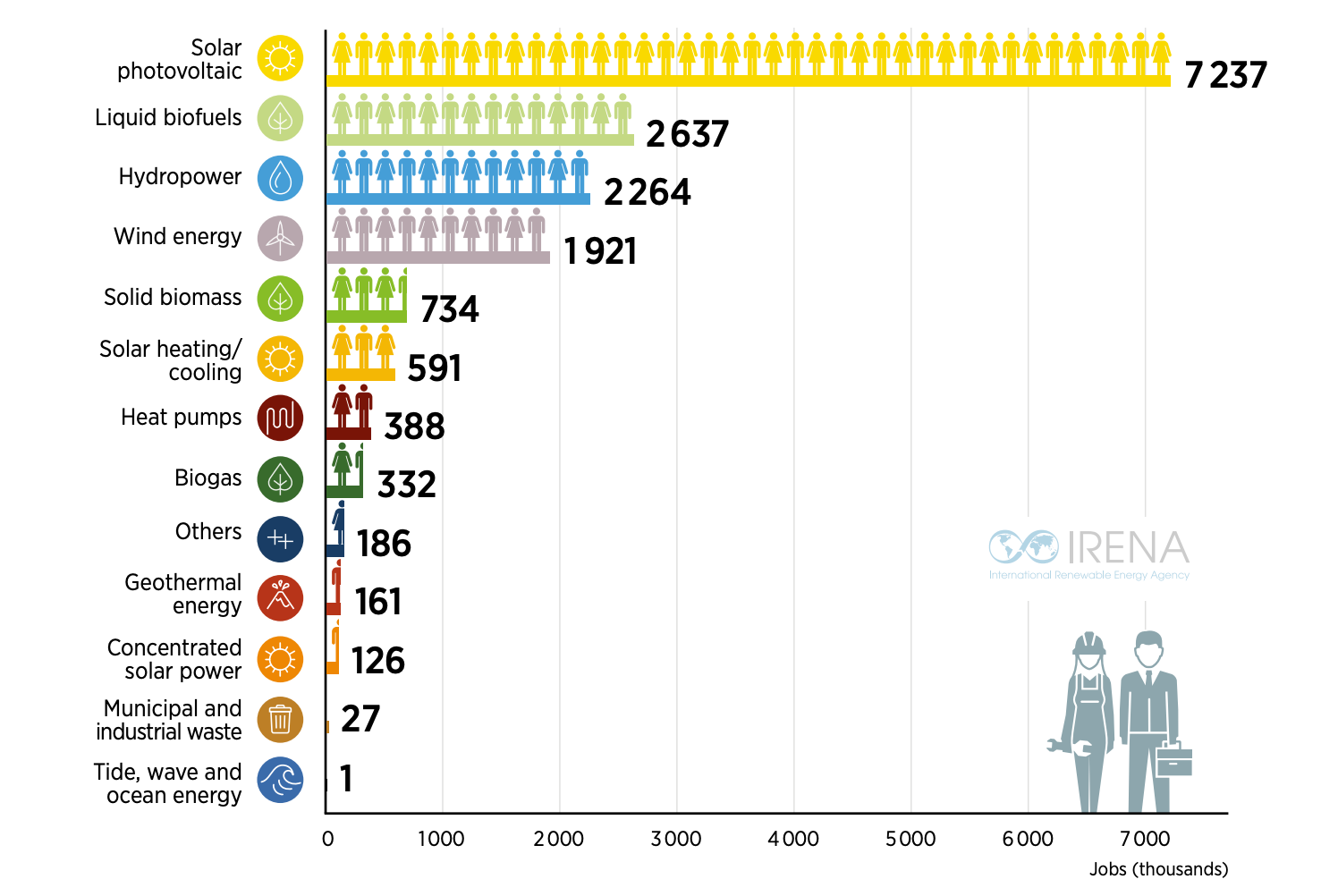 Global renewable energy employment, by technology, 2024 by IRENA