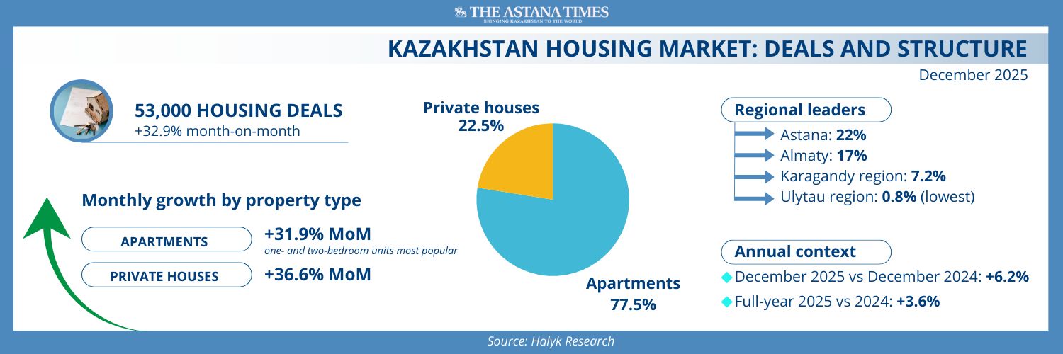 In December 2025, Kazakhstan’s real estate market followed a familiar seasonal pattern, recording a sharp rise in transactions. A total of 53,000 housing purchase-and-sale transactions were registered, marking a 32.9% increase compared to November. Apartments in multi-unit buildings accounted for 77.5% of all deals, while 22.5% involved private houses. The highest transaction activity was recorded in Astana (22%) and Almaty (17%), followed by the Karagandy region (7.2%), whereas the Ulytau region again posted the lowest share at 0.8%.