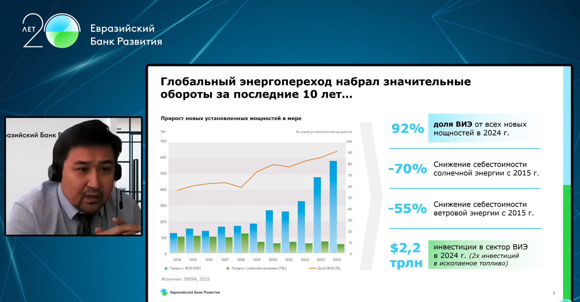Arman Akhunbayev, head of the Industry Analysis Center at the EDB, presented data showing the increase in newly installed power generation capacity worldwide from 2014 to 2024.