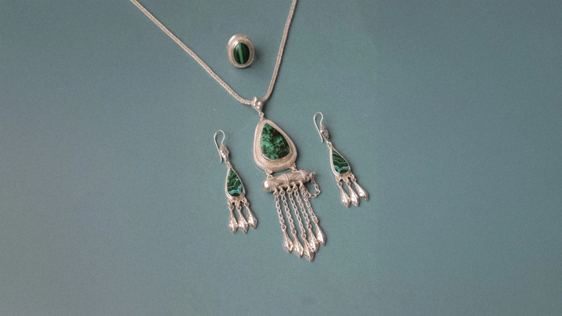 Silver jewelry set featuring traditional kazakh design elements. Photo credit: Damir Torebai’s personal archives