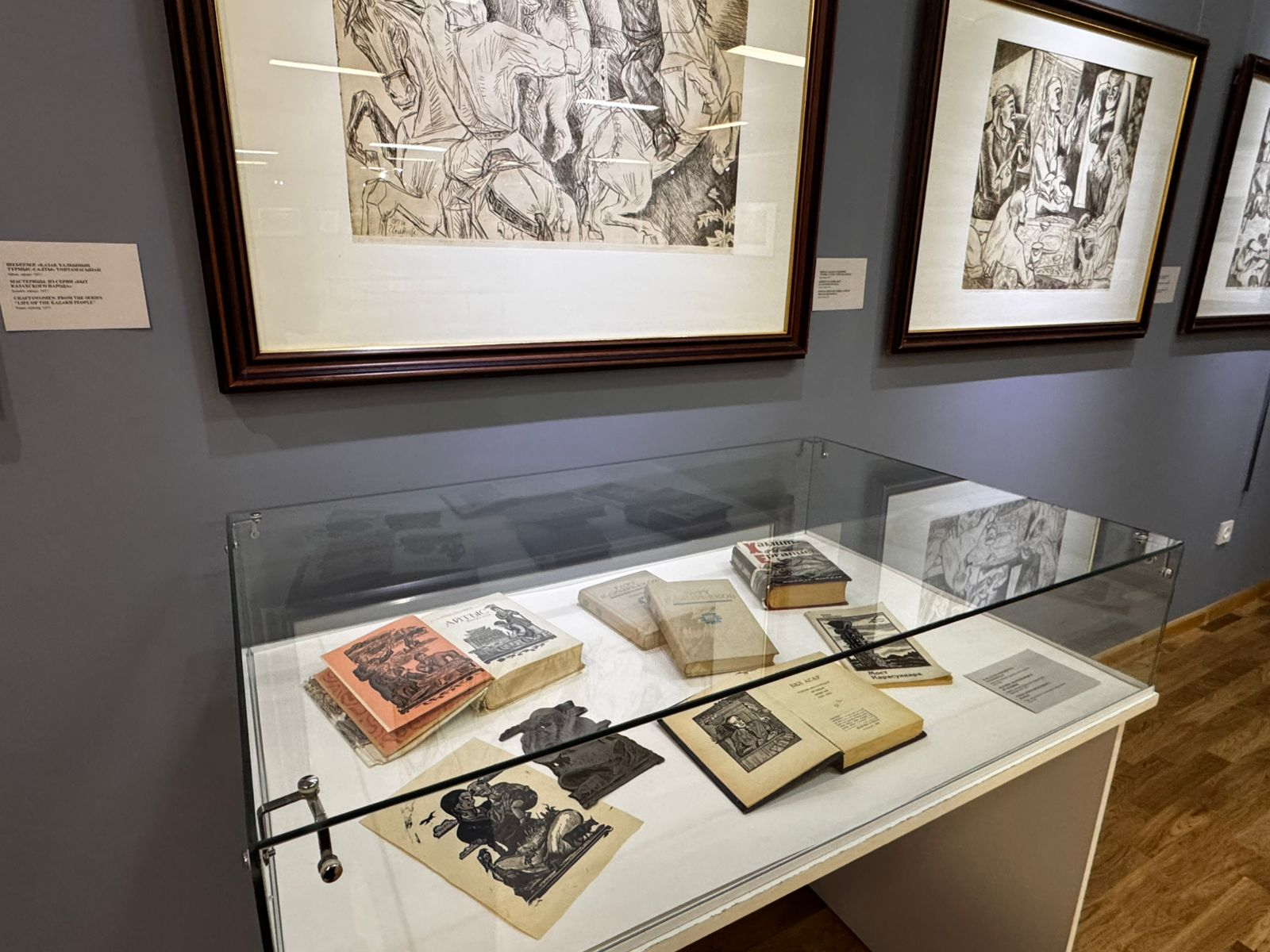 One of the central highlights is his illustration series for the heroic epic Koblandy Batyr, presented alongside the published edition. The exhibition is arranged chronologically, allowing visitors to trace the evolution of his artistic style from the 1960s onward.